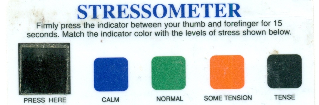 You could even have students evaluate the "stressometer." You or your students can download the free Android app from here , buy a card from here (the card itself costs less than a dollar) or just show them a picture of the stress-o-meter card (see below). It is interesting that the same card is sold as a "stress card," "mood card," and "love card." The card responds to body temperature which is claimed to reflect mood.
